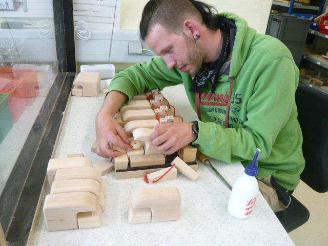 In der Spielzeugmanufaktur Pfingstweid am Bodensee werden von derzeit 22 Menschen mit unterschiedlichen Einschränkungen hochwertige Holzspielzeuge für Kleinkinder hergestellt.